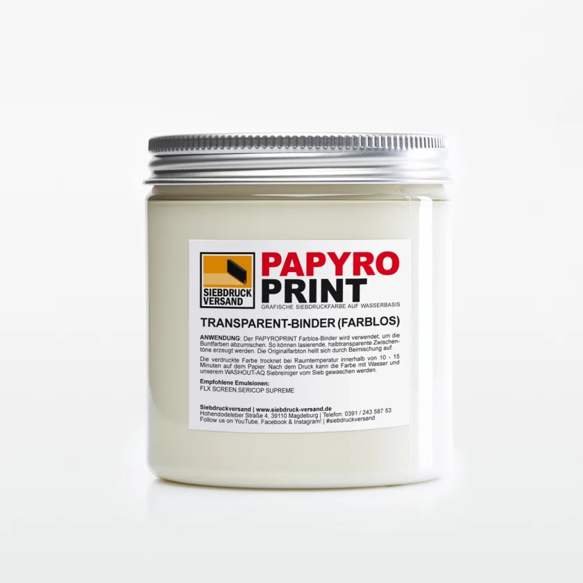 Bezfarebné spojivo PAPYROPRINT sa používa na miešanie farebných atramentov PAPYROPRINT. Týmto spôsobom je možné vytvoriť priesvitné, polopriehľadné medzitóny. Pôvodný farebný tón je pridaním mierne zosvetlený a pôsobí čistejšie. V praxi sa transparentné spojivo často používa, keď majú byť farby tlačené priesvitne pomocou duplexného procesu.