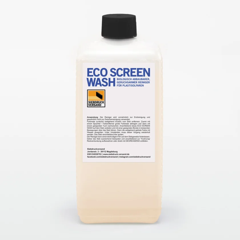 Každý, kto pracuje s plastisolovými farbami, by mal mať doma tento účinný, bez riediteľného zápachu a biologicky odbúrateľný čistič. ECO SCREEN WASH odstraňuje odolné zvyšky atramentu a veľký podiel duchov.