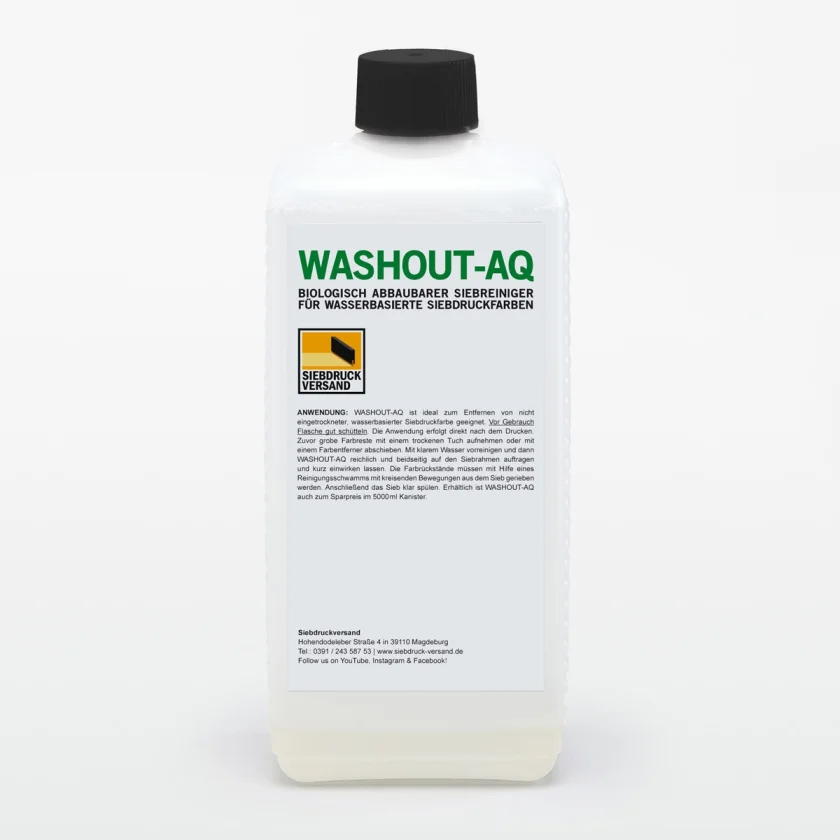 WASHOUT-AQ je biologicky odbúrateľný čistič na vodou riediteľné farby, ktorý spoľahlivo odstraňuje zvyšky farby zo sieťoviny a zabraňuje tak vzniku duchov. Je možné ho tiež použiť na čistenie tlačových stolov a pracovných nástrojov (stierka, maliarska špachtľa). Na rozdiel od mnohých bežných čističov sít je možné tento produkt vypúšťať do odpadovej vody