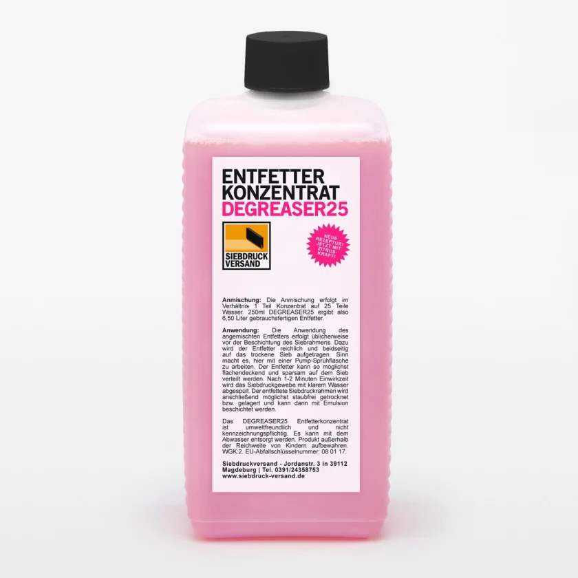 DEGREASER25 je odmasťovací koncentrát v pomere 1:25. Používa sa na namiešanie odmasťovača pripraveného na použitie. Tento odmasťovač pripravený na použitie sa používa na optimálnu prípravu tkaniny nových aj použitých sieťotlačových rámov. Pokiaľ majú byť sieťotlačové rámčeky znovu potiahnuté fotoemulziou, odporúča sa sito vopred odmastiť. Všetky zvyšky prachu a mastnoty, ktoré by mohli spôsobiť separáciu medzi emulziou a tkaninou, sú účinne odstránené.