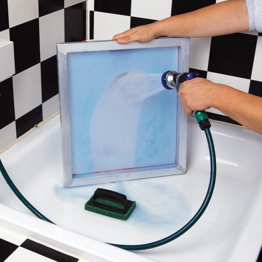 čističa sít . Týmto spôsobom môže prostriedok pôsobiť priamo na emulziu. Odvrstvovač pripravený na použitie sa potom hojne nanesie na obe strany sita pomocou rozprašovacej pumpičky. Po 3-5 minútach pôsobenia sa odporúča odstrániť zmäknutú emulziu drsnou hubkou. Sito je potom nutné opláchnuť silným prúdom vody (ideálne vysokotlakovým čističom). Pri použití dbajte na to, aby odvrstvovač na látke nezaschol. Najneskôr po odporúčanej dobe pôsobenia 3-5 minút by sa mal z látky vymyť.