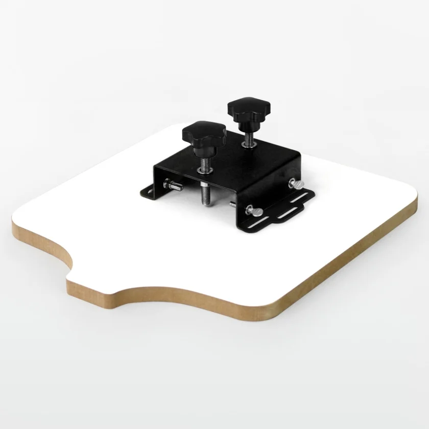 Ak chcete potlačiť textil profesionálne, potrebujete tlačovú dosku správnej veľkosti. Naše sieťotlačové stroje sú štandardne vybavené doskou o rozmere 55 x 45 cm. Ak máte v úmysle tlačiť na menšie XS tričká, tašky alebo dojčenské oblečenie, potrebujete na to špeciálne dosky. Na pripevnenie týchto dosiek k strojom je potrebné zavesenie prítlačných dosiek. Takže toto zavesenie je spojovacím kusom medzi doskou a strojom.