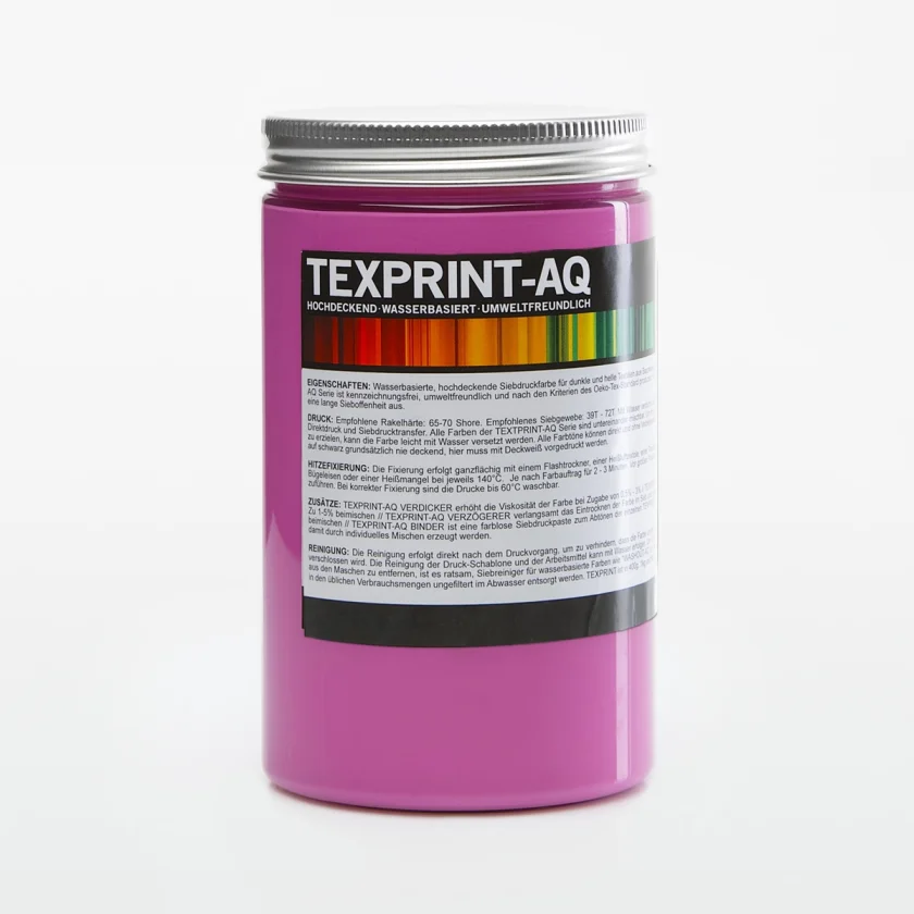TEXPRINT-AQ je nepriehľadná prémiová sieťotlačová farba pre tmavé, stredne farebné a svetlé textílie vyrobené z bavlny, polyesteru, syntetiky a zmesových tkanín. Farba je na vodnej báze, šetrná k životnému prostrediu a vyrobená podľa kritérií normy Oeko-Tex-100. Atrament je jednozložkový a pripravený na tlač. Zaujme kvalitnými výsledkami tlače a veľmi dobrou odolnosťou proti praniu. Vhodné na tričká, tašky, mikiny s kapucňou, šortky atď.