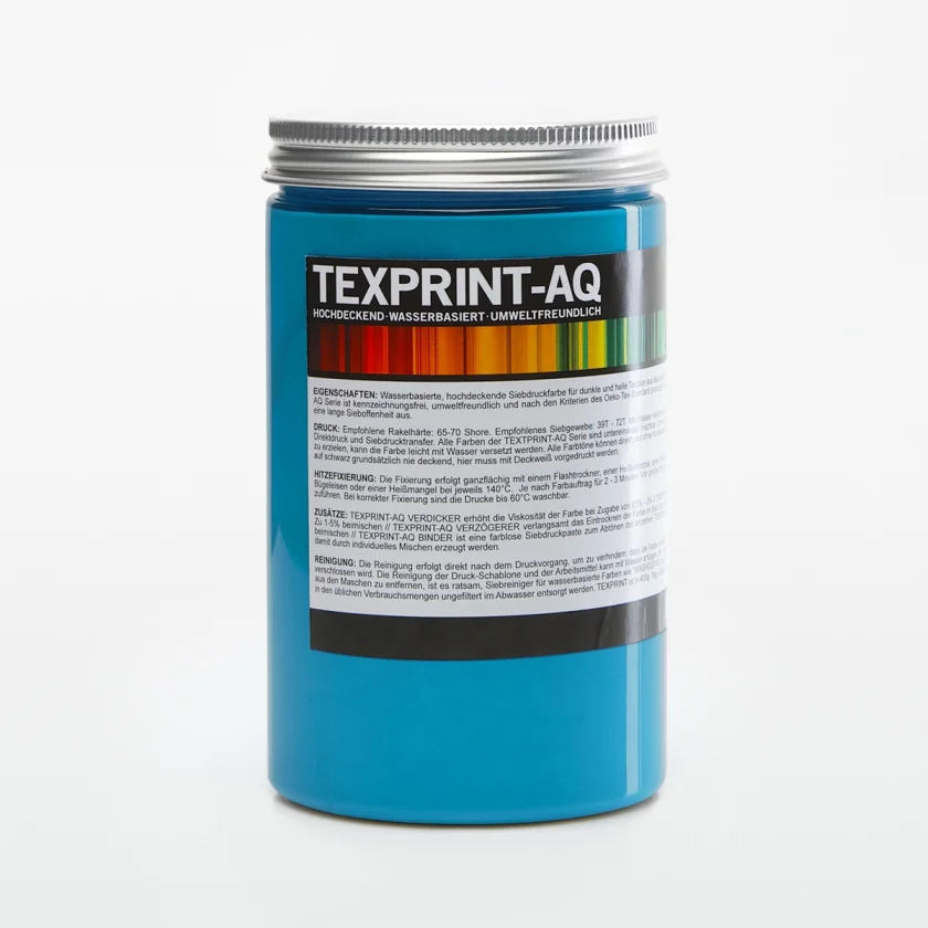 TEXPRINT-AQ je nepriehľadná prémiová sieťotlačová farba pre tmavé, stredne farebné a svetlé textílie vyrobené z bavlny, polyesteru, syntetiky a zmesových tkanín. Farba je na vodnej báze, šetrná k životnému prostrediu a vyrobená podľa kritérií normy Oeko-Tex-100. Atrament je jednozložkový a pripravený na tlač. Zaujme kvalitnými výsledkami tlače a veľmi dobrou odolnosťou proti praniu. Vhodné na tričká, tašky, mikiny s kapucňou, šortky atď.