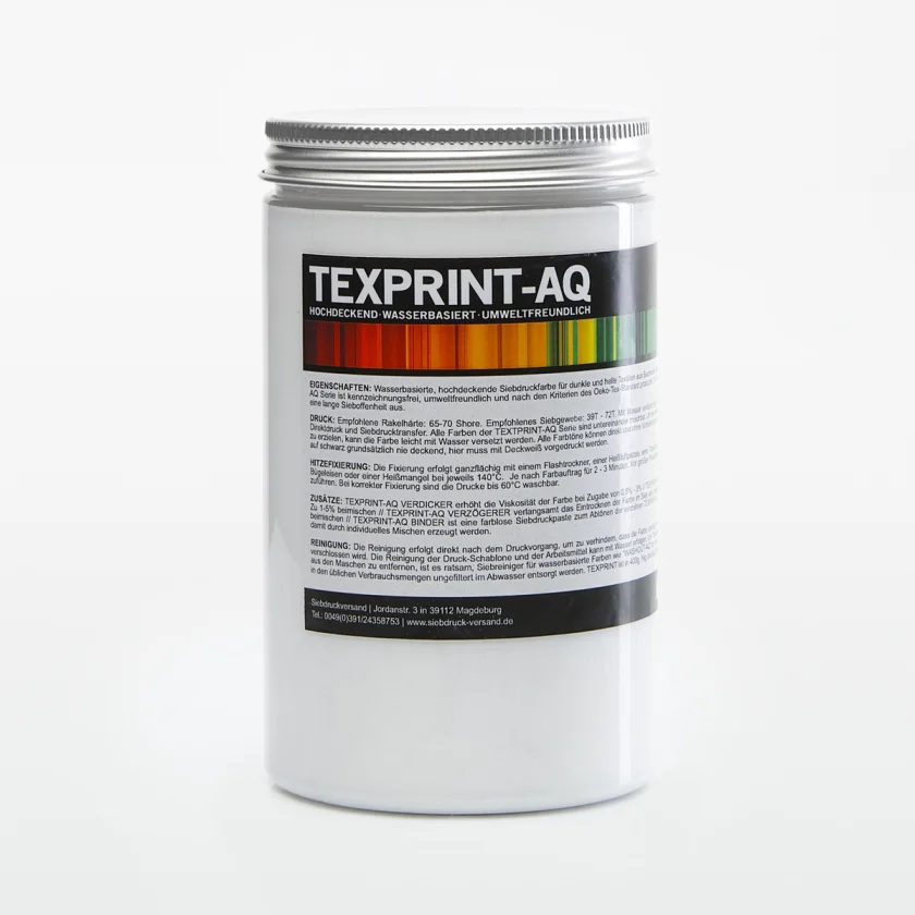 TEXPRINT-AQ je nepriehľadná prémiová sieťotlačová farba pre tmavé, stredne farebné a svetlé textílie vyrobené z bavlny, polyesteru, syntetiky a zmesových tkanín. Farba je na vodnej báze, šetrná k životnému prostrediu a vyrobená podľa kritérií normy Oeko-Tex-100. Atrament je jednozložkový a pripravený na tlač. Zaujme kvalitnými výsledkami tlače a veľmi dobrou odolnosťou proti praniu. Vhodné na tričká, tašky, mikiny s kapucňou, šortky atď.