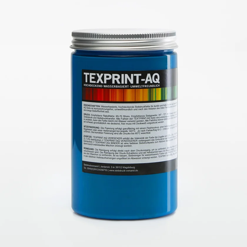 TEXPRINT-AQ je nepriehľadná prémiová sieťotlačová farba pre tmavé, stredne farebné a svetlé textílie vyrobené z bavlny, polyesteru, syntetiky a zmesových tkanín. Farba je na vodnej báze, šetrná k životnému prostrediu a vyrobená podľa kritérií normy Oeko-Tex-100. Atrament je jednozložkový a pripravený na tlač. Zaujme kvalitnými výsledkami tlače a veľmi dobrou odolnosťou proti praniu. Vhodné na tričká, tašky, mikiny s kapucňou, šortky atď.
