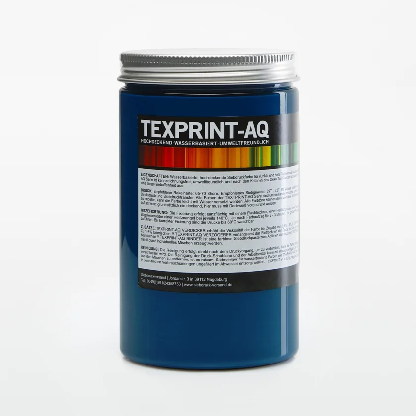 TEXPRINT-AQ je nepriehľadná prémiová sieťotlačová farba pre tmavé, stredne farebné a svetlé textílie vyrobené z bavlny, polyesteru, syntetiky a zmesových tkanín. Farba je na vodnej báze, šetrná k životnému prostrediu a vyrobená podľa kritérií normy Oeko-Tex-100. Atrament je jednozložkový a pripravený na tlač. Zaujme kvalitnými výsledkami tlače a veľmi dobrou odolnosťou proti praniu. Vhodné na tričká, tašky, mikiny s kapucňou, šortky atď.